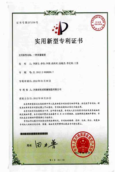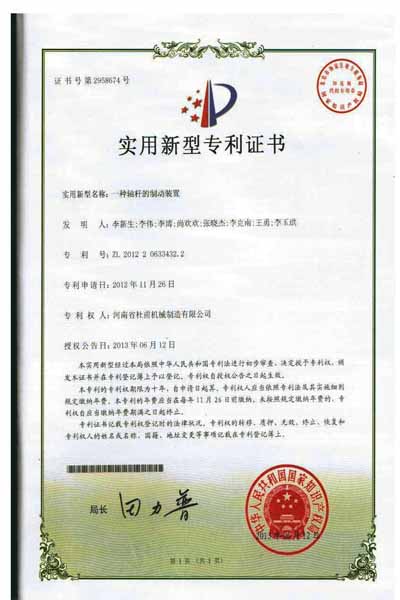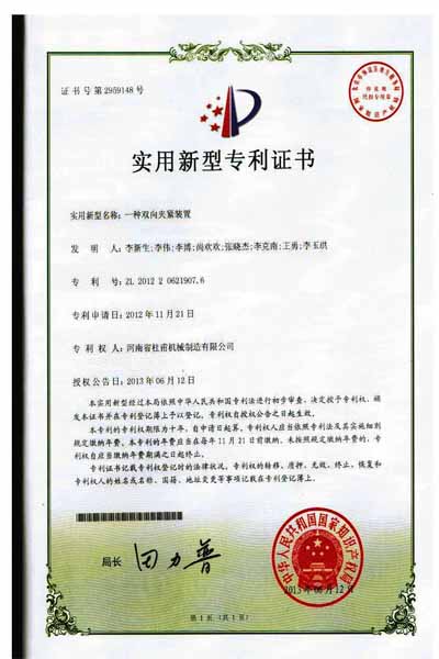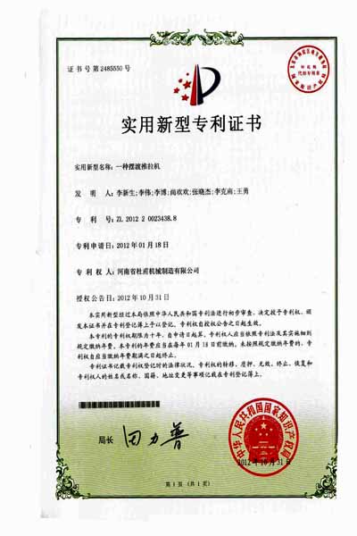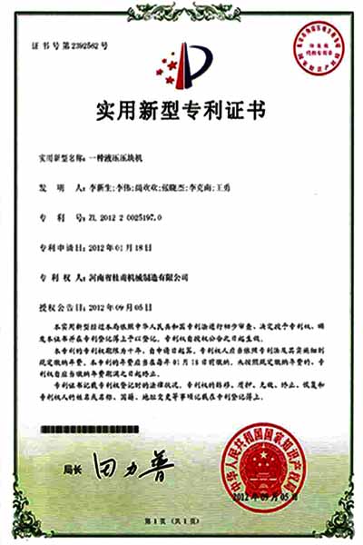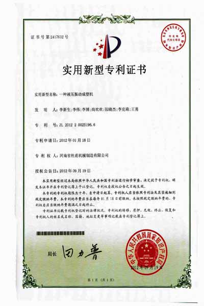 河南省杜甫機械自1998年開始,投入資金用于新型墻體材料系列設備的研制和開發。吸收和借鑒國內外成功經驗和先進技術,成功地開發了300—1200T全自動免燒磚成套設備投放市場以來,已為百余家大、中、小新型墻體材料生產企業提供了較為理想的生產設備。千錘百煉、百煉成鋼。2012年杜甫機械為該公司多項產品申請了實用新型專利,于2013年6月12號授權公告。以下是產品專利授權書。