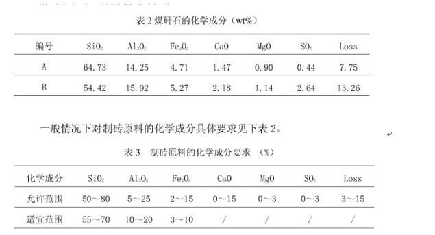 將A礦和B礦煤矸石原料分別進(jìn)行發(fā)熱策測試,其結(jié)果為:0.05MJ / kg (12cal / g ) ; (0.23MJ/ kg ( 55Cal/ g )。通常認(rèn)為燒結(jié)磚瓦所用配合料的發(fā)熱量以1672kJ / kg 左右為宜,由于煤矸石的形成過程復(fù)雜,其發(fā)熱量變化較大,所以制磚用原料的煤矸石必須進(jìn)行發(fā)熱量的測定,以便根據(jù)焙燒制品需要的熱值,確定不同的配合比來進(jìn)行控制,使得配合料的發(fā)熱量在更佳值附件波動。