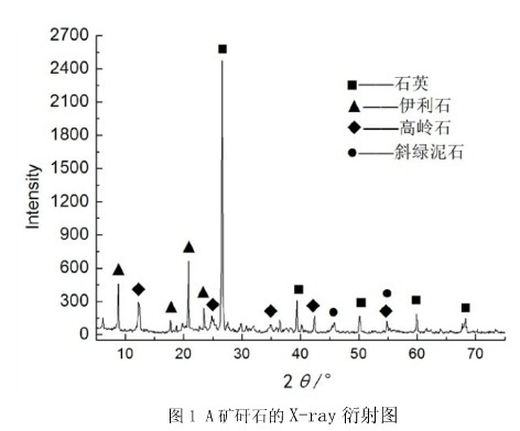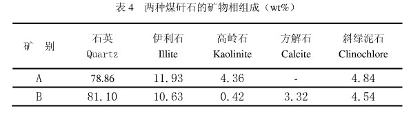未了解兩種煤矸石的礦物組成,對它們分別進(jìn)行物相分析,其X-ray衍射圖如圖 l 、圖 2 所示。從中可以看出, A 礦矸石的主要礦物相為石英、高齡石和伊利石和斜綠泥石;B礦矸石的主要礦物相為石英、高嶺石、伊利石、斜綠泥石和方解石。兩礦矸石中各礦物相含量見表 4 。