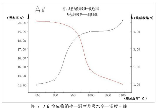 將 A 、B兩礦煤矸原料,經(jīng)人工破碎,全部經(jīng)過1mm篩,混合均勻后,以備后期各項測試使用。采用煤矸石真空磚機(jī)擠出成型,該磚機(jī)出口尺寸50.0 mm:x 25.0mm。以小型試塊[ 50 x 25 x 10 (mm ) ]在高溫梯度爐中焙燒,梯度爐焙燒后的小試塊進(jìn)行燒成收縮率和吸水率測定,以確定該混合料的擠燒溫度范圍及更佳燒成溫度。燒成收縮率一溫度及吸水率一溫度曲線,見下圖 5 ,圖 6 。
