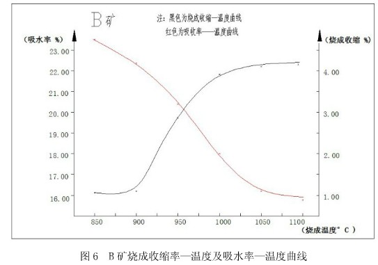 由圖 4 和圖 5 可以看出,隨著燒結(jié)溫度的升高,制品的吸水率呈下降趨勢,燒成收縮率呈上升趨勢,到達(dá)燒結(jié)溫度時,制品的吸水率與燒成收縮率都達(dá)到平穩(wěn)值。 A礦在950℃~ 1000℃ 之間發(fā)生燒結(jié),制品變的致密;B礦在1000℃~1050℃之間發(fā)生燒結(jié),制品變的致密。一般制磚原料的燒成線收縮率控制在2一5%。由此可知,A礦和B礦原料燒成線收縮率符合制磚要求。由此可知煤矸石是可以制磚的。