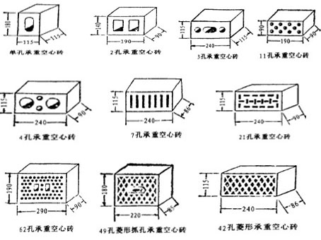 目前,我國生產的承重空心磚的規格較多.孔型也較多(如有圓形、橢圓形、長方形、方型、菱型、三角型)。承重空心磚絕大多數為垂直孔。見表1-1-2和圖1-1-1。