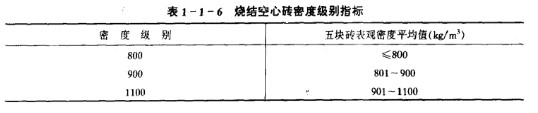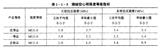 ② 強度等級與產品等級:燒結空心磚根據其大面和條面的抗壓強度分為MU5.0、 MU3.0、MU2.0三個強度等級,同時又按其表觀密度分為800、900、1100三個密度級別。每個密度級別根據其孔洞及孔排列數、尺寸偏差、外觀質量,強度等級和耐久性等分為優等品(A)、一等品(B)和合格品(C)三個產品等級。各產品的等級對應的強度等級及指標要求見表1一l一5。各密度級別指標見表1