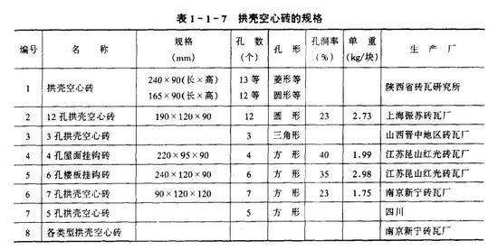 拱殼空心磚是我國在70 年代研制成功的,它的一端有鉤,另一端帶凹槽.施工時利用磚與磚之間的掛鉤懸砌.砌筑磚拱殼不用模板支撐,而只要一個簡單的樣架控制曲線。.拱殼空心磚是一種適宜砌筑拱和薄殼的新型建筑材料。參見表l一l一7和圖l一1一4。拱殼磚是一種結構材料。建筑物的防水、隔熱需采用另外的措施來解決。在地震區和有強烈振動的建筑物.在未采取有效措施前也不宜采用。