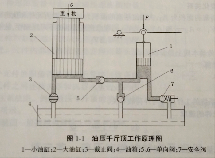 油壓千斤頂的液壓系統主要部件是一大一小油缸,兩個油缸用管子連接起來,每個油缸活塞下面都有密封可變容積,密封可變容積內充滿了不可壓縮的液壓油。