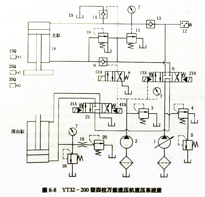 回油:主缸下腔→順序閥10→主缸換向閥6(左位)→頂出缸換向閥21(中位)→油箱。