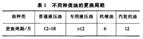 除工作環境會對液壓油造成污染外,液壓泵、液壓閥等正常磨損后所產生的金屬微位、橡膠密封件磨損產生的像膠顆粒、濾油器的濾芯和高壓橡膠軟管疲勞磨損所產生的脫落物等也會造成液壓油的污染。所以,應每隔一段時間,對系統的油進行抽樣檢查,分析其污染程度是否還在該系統允許的使用范圍內。如不合要求,必須立即更換,不應在油臟到使系統出現故障時才更換。更換液壓油的期限,因油品種、工作環境、運行工況不同而有很大不同。一般來說,在連續運轉、高溫、高濕、灰塵多的地方,需要縮短換油的周期。表1給出不同種類油的更換周期。