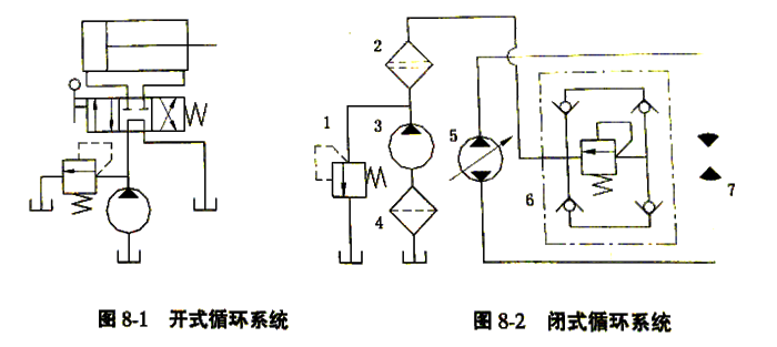 開式循環系統是指油泵從油箱吸油,輸出的壓力油進人執行元件,執行元件的回油到油箱,如圖8-1所示。開式循環系統的優點是結構簡單,散熱條件好,維護方便。缺點是油液與空氣接觸機會多,容易受到污染。開式循環系統應用比較廣泛。