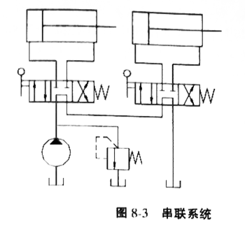 如圖8-3所示,串聯系統中各個執行元件之間為串聯,前一個執行元件的回油進人下一個執行元件,串聯系統中常采用M機能的換向閥。串聯油路中各個執行元件同時工作時,油泵要同時克服所有串聯執行元件的外載荷。各個執行元件的速度與本身的外載荷無直接關系。串聯油路的特點是各個執行元件可以單獨動作,也可以輕載復合動作,油液循環路線長,故總的壓力損失比較大。