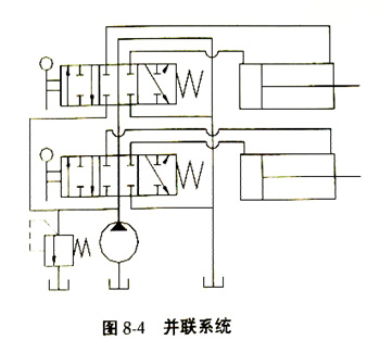 如圖8-4所示,并聯系統中各個執行元件的進油路聯結在一起,回油路聯結在一起,換向閥常采用O型機能的。為了能使油泵卸菏,換向閥用三位六通閥,當用三位四通閥時,安全閥用電滋溢流閥。并聯油路的特點是各個執行元件只能單獨動作,難以實現復合動作,油路循環路線短,壓力損失小。