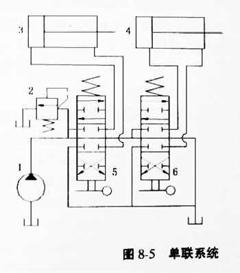 當用一個油泵驅動多個執行元件時,各個執行元件之間可以有串聯、并聯、單聯和復聯四種連接方式。