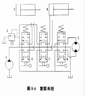 復聯系統是由前面三種聯結組合而成的混合系統,如圖8-6所示換向閥6、7(執行元件3、4)之間為并聯,換向閥6、7和8(執行元件3、4和5)之間為串并聯,該系統兼有并聯和串聯的特點。