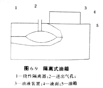 在周圍環境惡劣、灰塵特別多的場合,可采用隔離式油箱,如圖6-9。當泵吸油時,撓性隔離器1上的孔2進氣;當泵停止工作,油液排回油箱時,撓性隔離器1被壓癟,孔2排氣,所以油液在不與外界空氣接觸的條件下,液面壓力仍能保持為大氣壓力。撓性隔離器的容積應比泵的流量大25%以上。