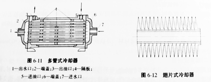 圖6-12為翅片式水冷卻器,水從管內流過,油液在水管外面通過,油管外部加裝橫向或縱向散熱翅片,以增加散熱面積,其冷卻效果比其他冷卻器提高數倍。