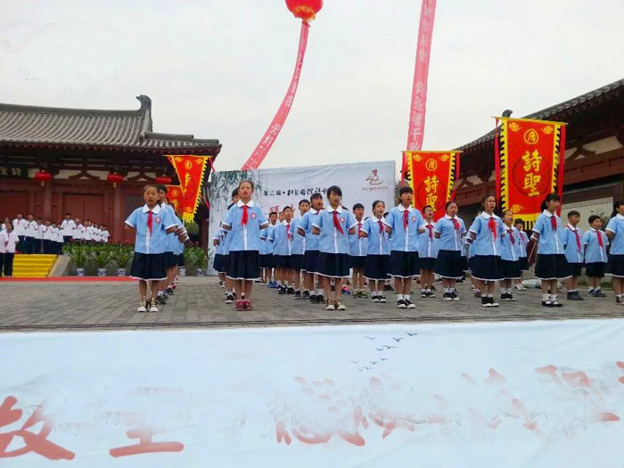 小學生在活動現場進行表演。當日,第二屆杜甫國際詩歌節在河南鞏義舉行。近百名中小學生集體朗誦杜甫詩歌,表達對“詩圣”的緬懷敬仰。
